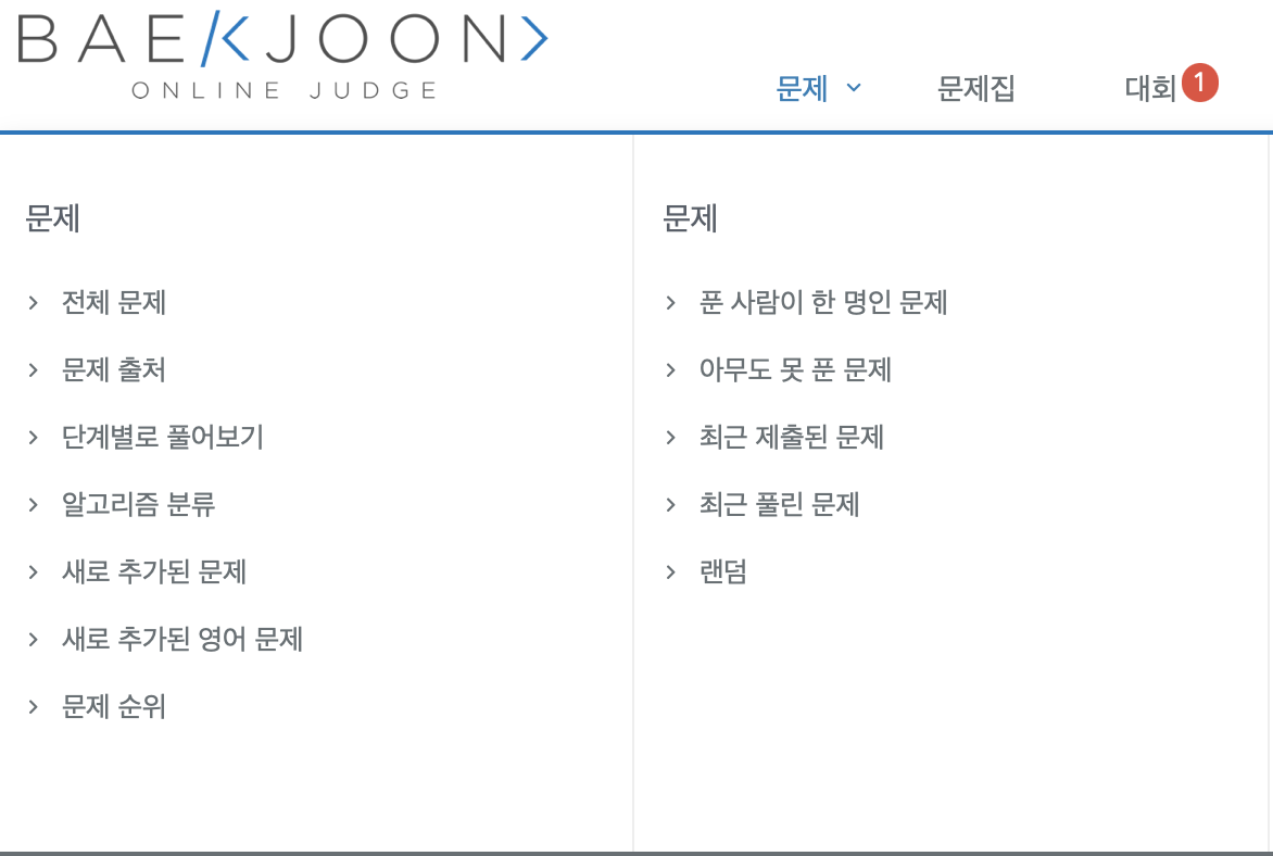 해당 사이트는 알고리즘 문제 풀이를 하는 백준 이라는 사이트이다. 백준 사이트 상단의 문제 탭에 마우스를 갖다 대면 이와 같이 아래로 메뉴들이 나온다. 드롭다운은 이처럼 특정 탭에 대한 하위 요소로 들어가고 싶을 때 사용되는 애니메이션 종류이다.