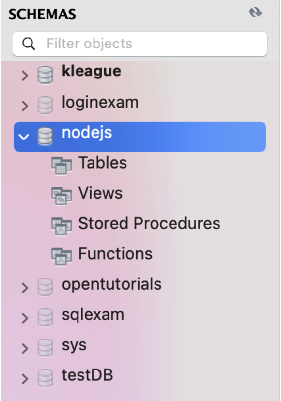 → MysqlWorkbench를 통해서 본 필자의 스키마 목록이다. nodejs가 추가된 것을 확인할 수 있다. 아직 테이블은 생성하지 않았으므로 Tables는 비어있는 것 또한 확인할 수 있다.