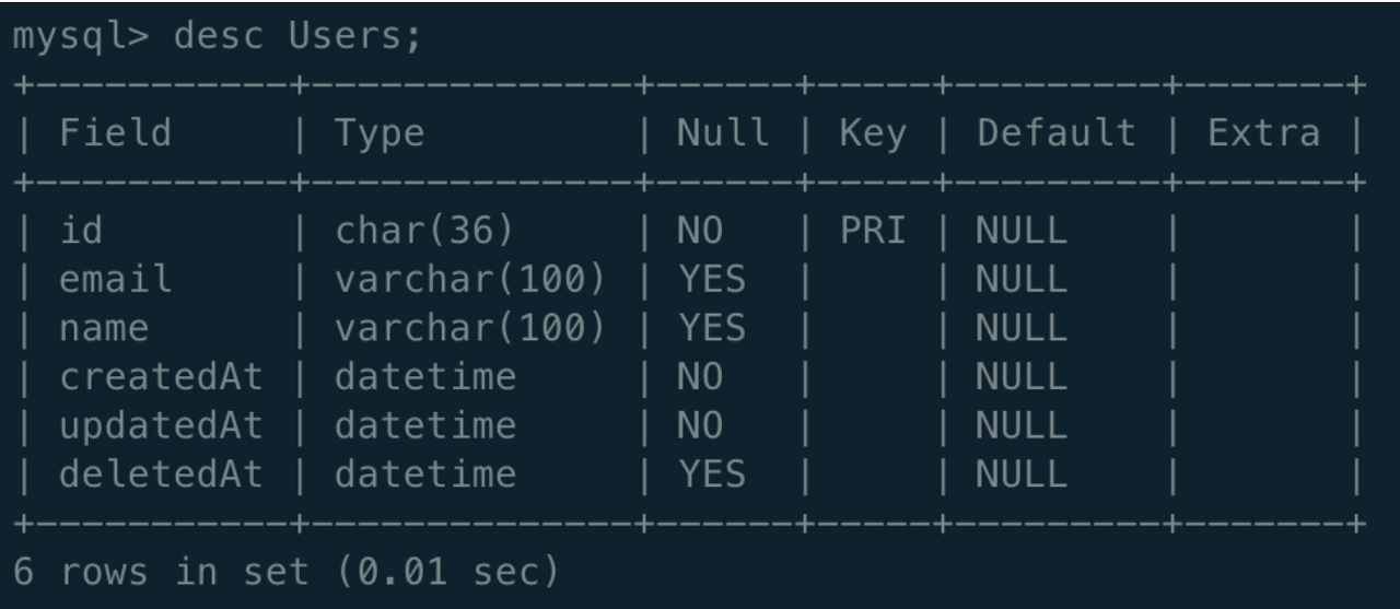 User.js에서 정의한 대로 필드가 생성된 것을 확인할 수 있다.