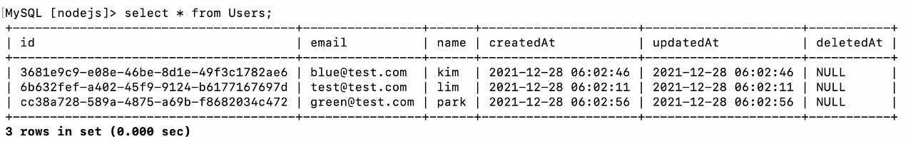 현재 데이터 자체가 실제로 삭제 되지는 않았지만 deletedAt 컬럼의 값이 수정된 것을 확인할 수 있다. 필자는 User.js에서 모델을 정의할 때 데이터가 삭제된 경우 타임스탬프를 남기도록 설정했기 때문에 위와 같이 결과가 나타난 것이다.