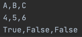 data = [["A", "B", "C"], [4, 5, 6], [True, False, False]]