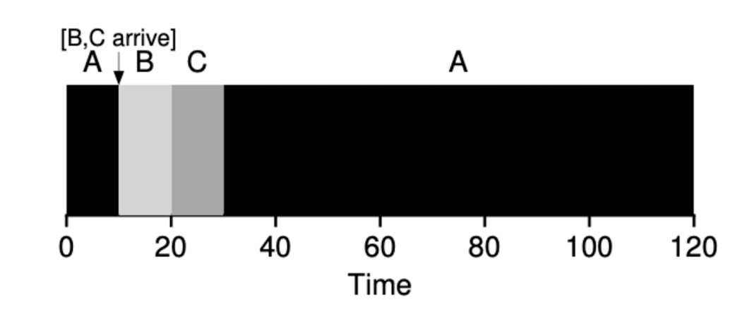 - 10초 시점에서 수행 시간이 짧은 B로 문맥 교환이 일어나며 B가 10만큼 일을 수행한다.