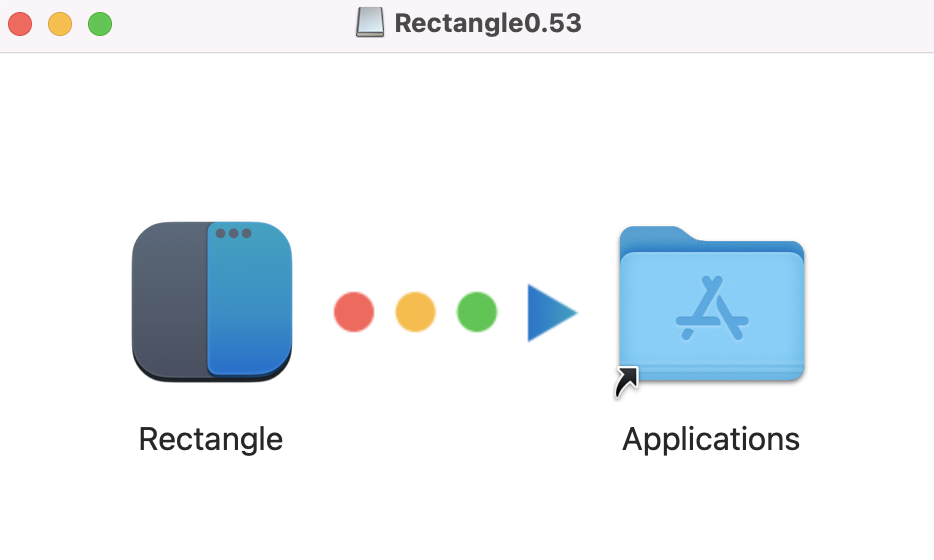 그리고 다운로드한 Rectangle0.53.dmg를 실행 후 Applications에 드래그를 하면 완료된다. (참고로 버전은 4/21(목) 기준 최신 버전이며 버전은 상이할 수 있다.) 그냥 일반 응용 프로그램 설치하듯 설치하면 끝이다.