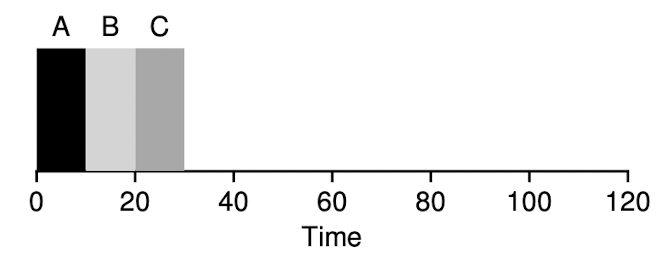 - 마지막으로 C가 CPU를 할당 받아 10만큼 일을 수행 후 120초 시점에서 일을 종료한다.