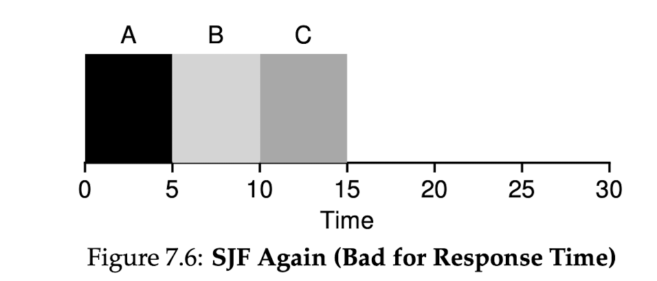 5초라는 시간이 보기에는 작은 값일 수도 있지만 사실 SJF 스케줄링 기법의 응답 시간은 매우 비효율적이다.