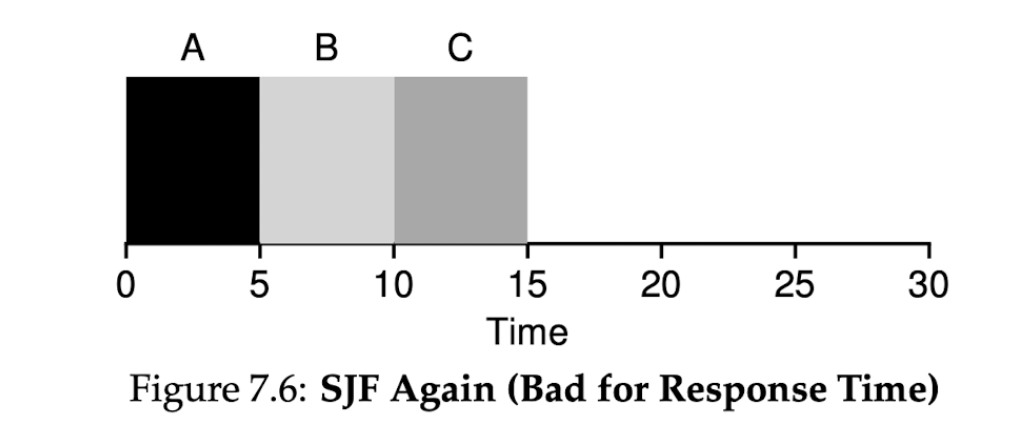 그래서 SJF 스케줄링 기법의 응답 시간(Reponse Time)은 (0 + 5 + 10) / 3 = 5sec 였다.