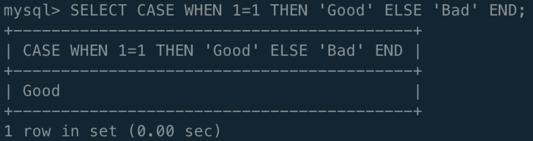 위 그림은 WHEN 절에 'good'='bad' 이라는 제약 사항이 있다. 해당 조건은 거짓 이므로 ELSE 뒤에 있는 'Bad' 문자열을 반환한다.