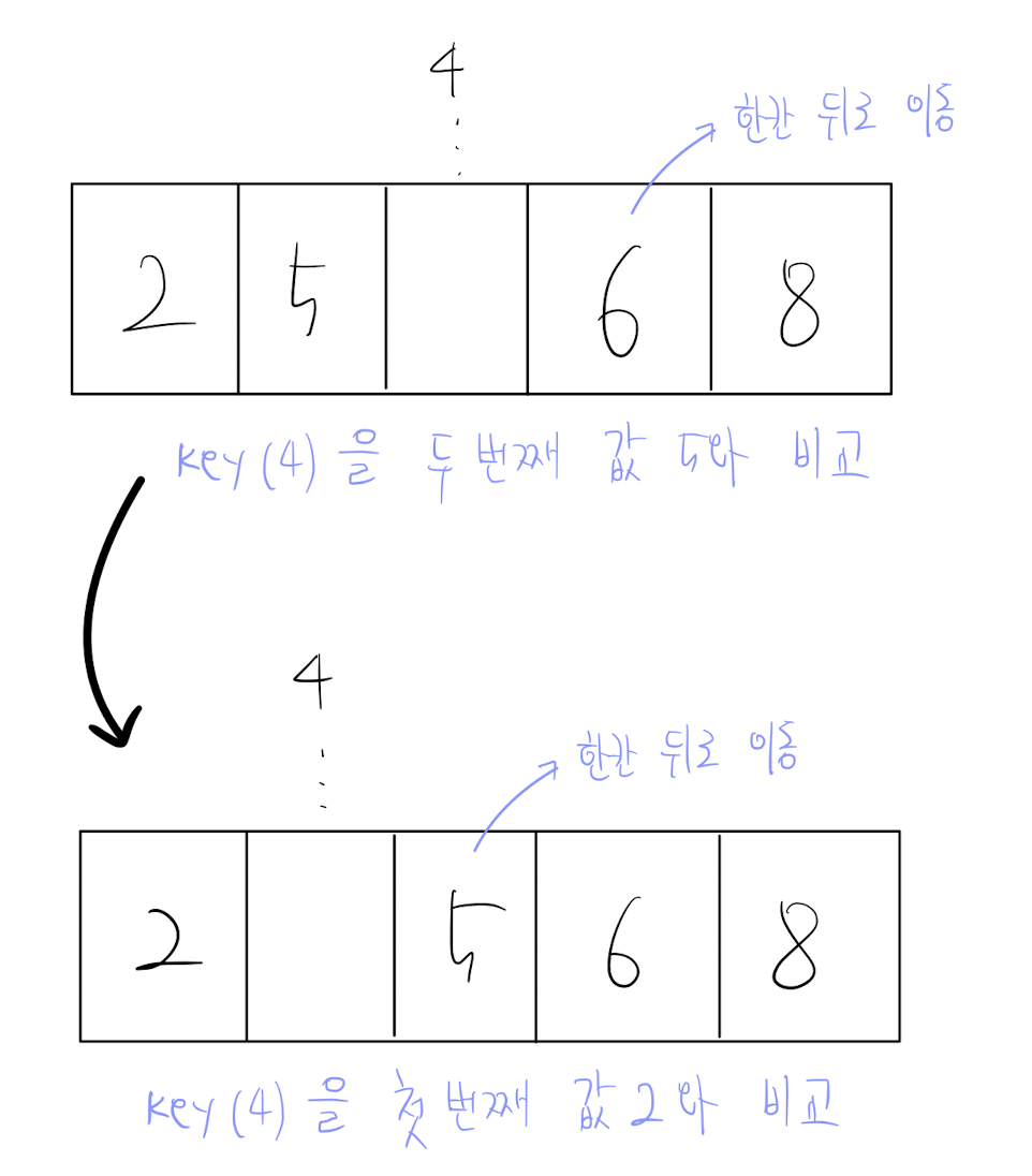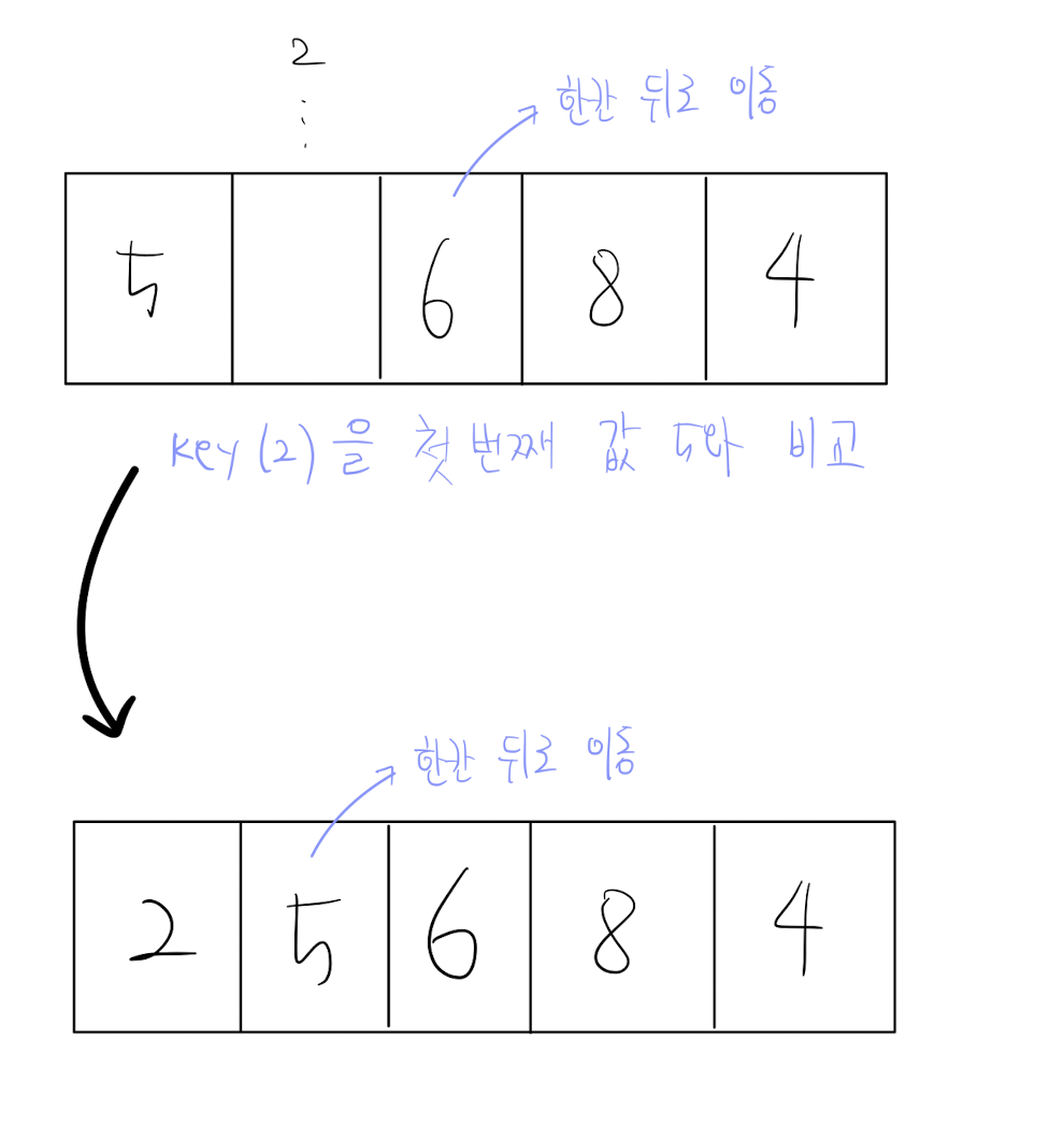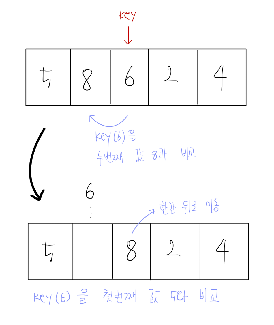 - Key(5)가 첫 번째 레코드인 8 보다 작으므로, 8을 Key의 자리에 넣고 5를 첫 번째 자리에 넣는다.