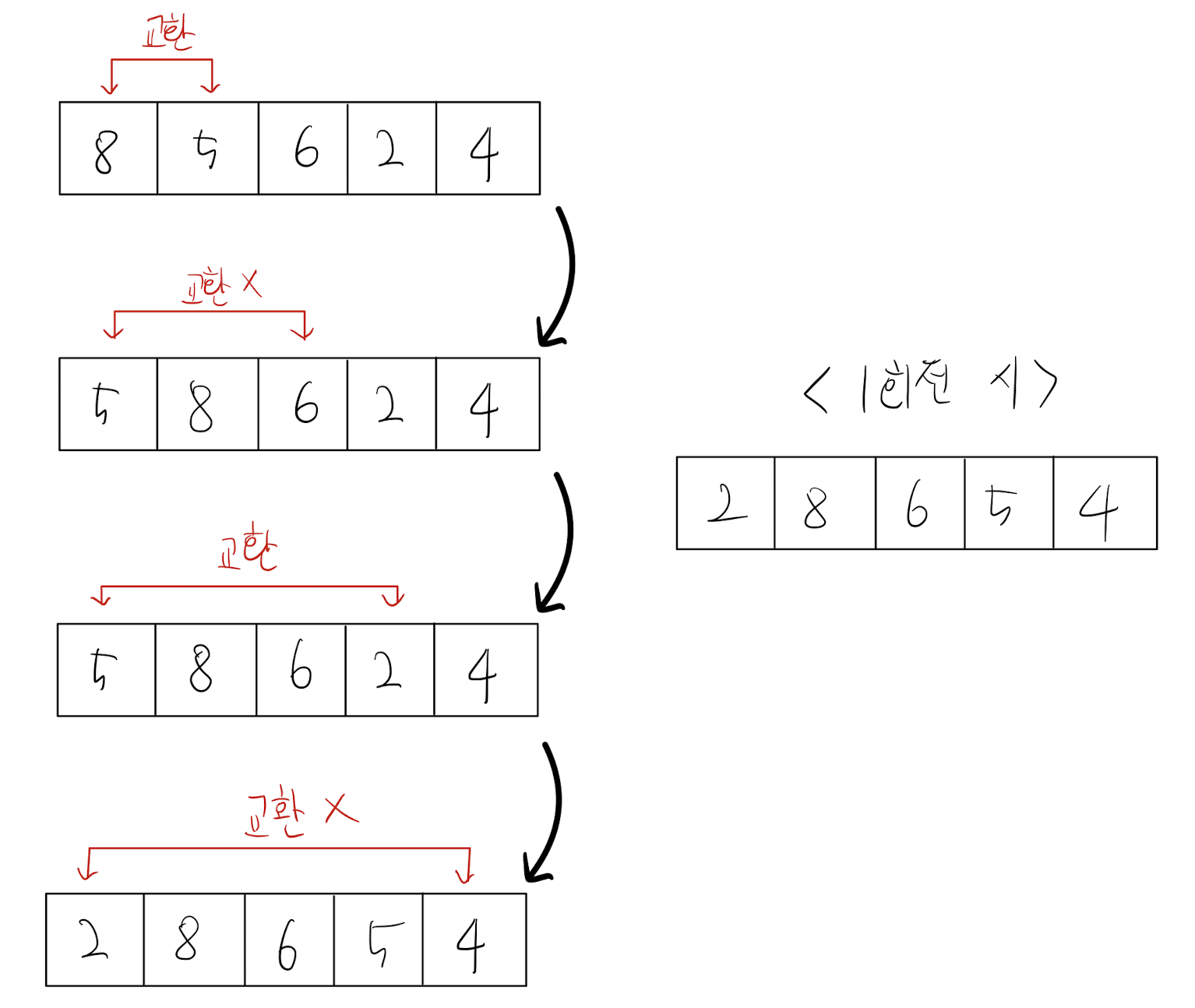 - 1회전 후 정렬 상태 : [2, 8, 6, 5, 4]