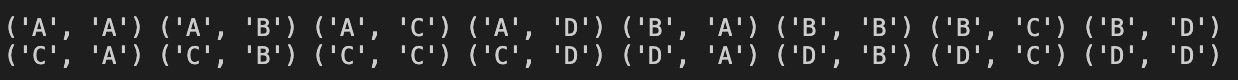 리스트 뿐만 아니라 문자열을 통해서도 데카르트 곱을 수행할 수 있다.