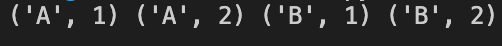 ('A', 1), ('A', 2), ('B', 1), ('B', 2)